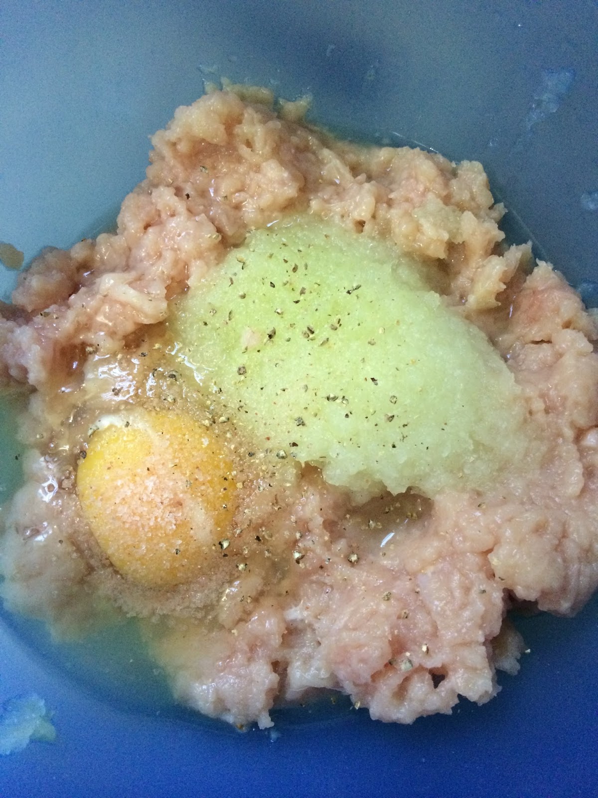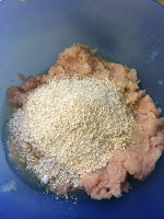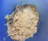 Misture bem o frango moído, a cebola, o ovo, o sal, a pimenta do reino e a aveia