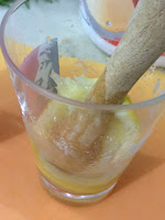 Num copo coloque dois pedaços do limão siciliano e macere com o adoçante.