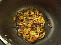 Numa panela coloque as colheres de azeite, deixe esquentar coloque as cebolas em rodelas e o ramo de tomilho. Fritar até ficar bem moreninho. Reservar